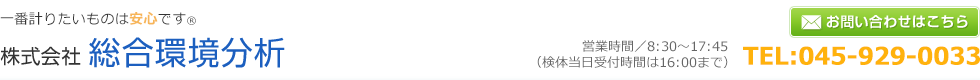 ◆経営本部(営業部営業課・総務部総務課) 〒226-0019 神奈川県横浜市緑区中山1-6-1 ミヨシズ・シードビル 301 [ 詳細 ] TEL : 045-929-0033(代) FAX:045-929-0039 (※検体のお持込みは本社分析センターへお願いいたします。) ◆本社分析センター TEL : 045-929-0033(代) FAX:045-929-0039 |